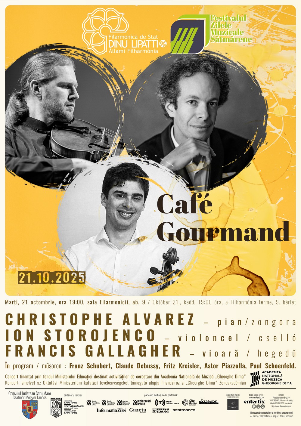 Kedden este különleges zenei találkozás várja a közönséget a Dinu Lipatti Filharmóniában: három hangszer, három művész, egyetlen közös lélegzet. Október 21-én, 19 órától a filharmónia hangversenytermében a Café Gourmand című koncerten a zene ínyencei megtapasztalhatják, hogyan olvad össze a zongora, a hegedű és a gordonka hangja egy elegáns, érzelmekkel teli kamarazenei párbeszéddé.