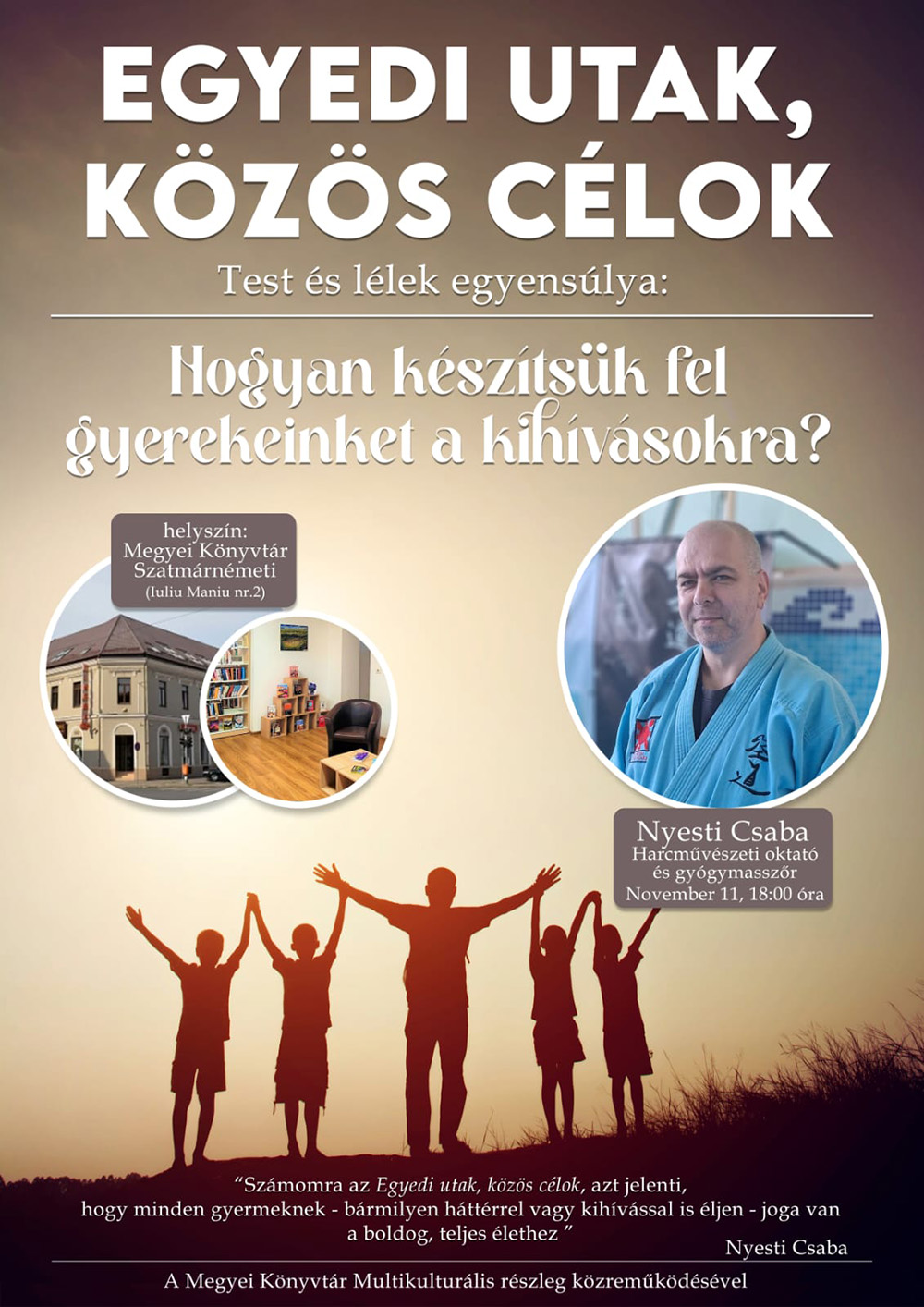 November 11-én, kedden 18 órától a Szatmárnémeti Megyei Könyvtár Multikulturális részlegében Nyesti Csaba harcművészeti oktató és gyógymasszőr tart előadást, aki több mint tíz éve dolgozik a gyermekek testi és mentális fejlesztésén.