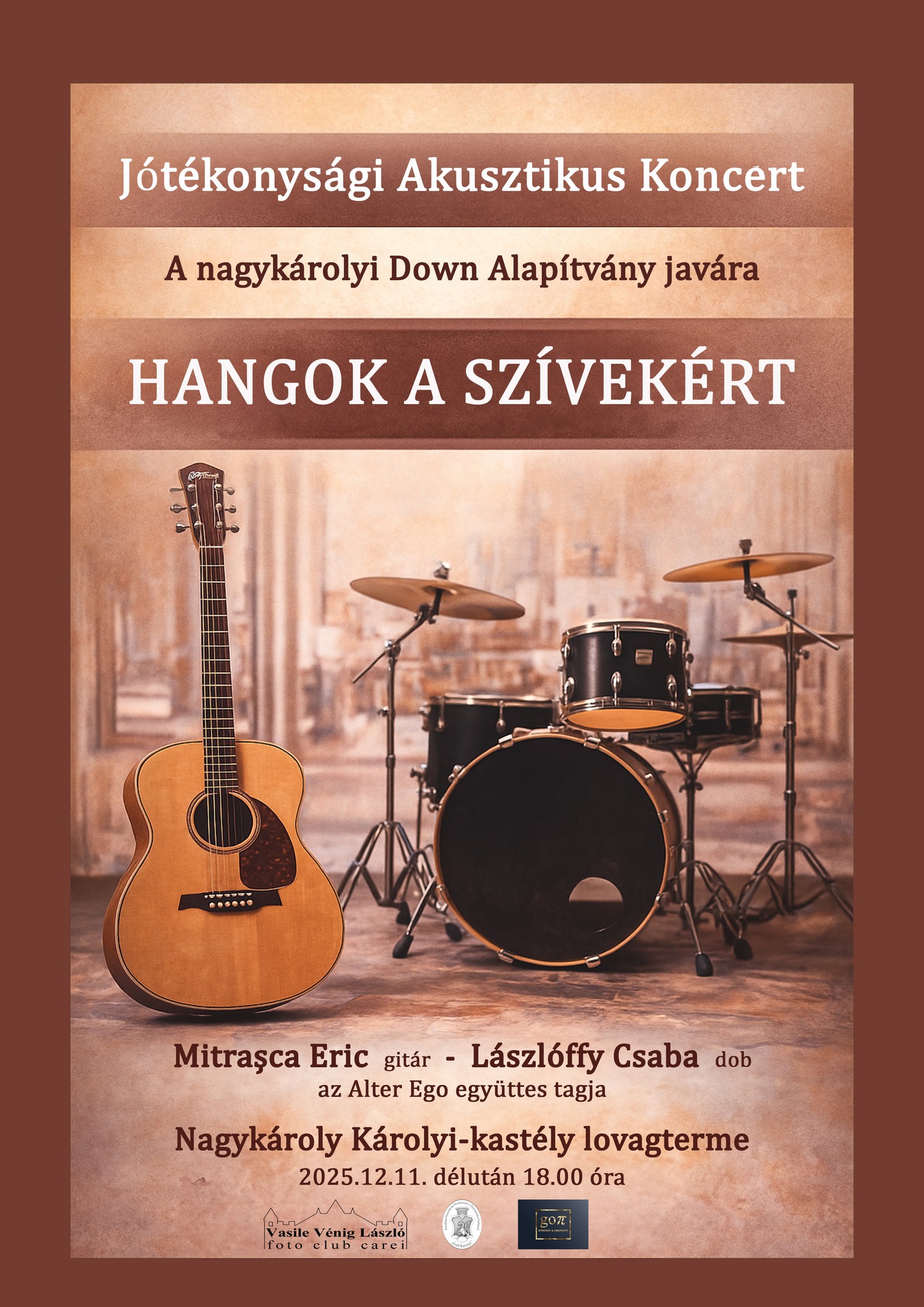 A nagykárolyi Down Alapítvány támogatására jótékonysági akusztikus koncert kerül megrendezésre 2025. december 11-én, 18:00 órától a nagykárolyi Károlyi-kastély Lovagtermében.