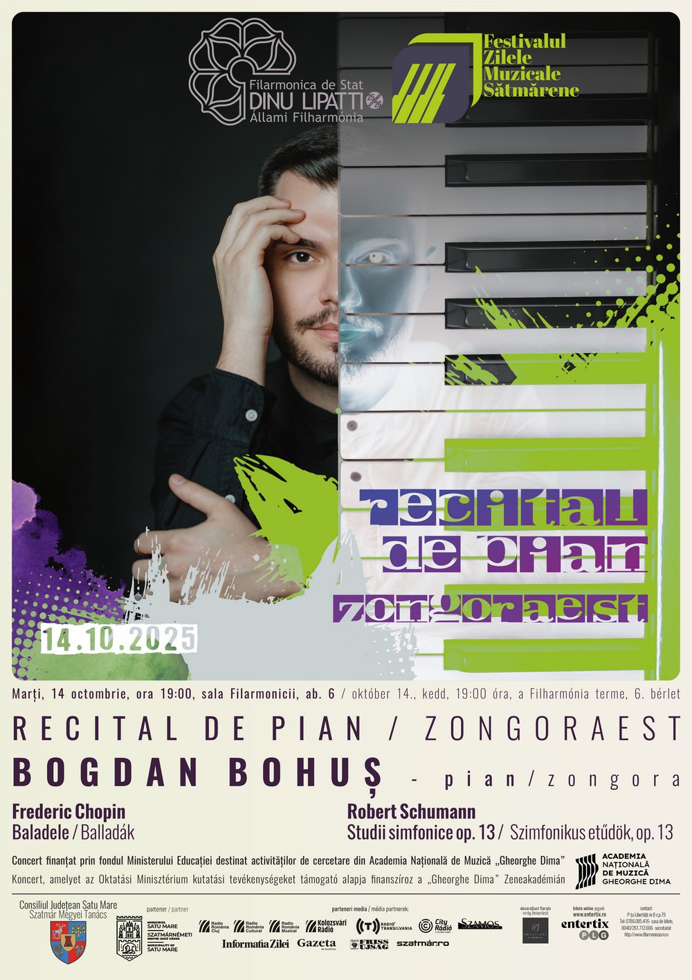 Kedden, október 14-én 19 órától Bogdan Bohuș zongoraművész lép a közönség elé egy érzelemdús és virtuóz szólóesttel. Műsoron: Frédéric Chopin négy balladája és Robert Schumann Szimfonikus etűdjei, op. 13 – két olyan műciklus, amely a romantika teljes skáláját járja be a költői álmodozástól a drámai kitörésekig. A zongoraest igazi utazás lesz líra és szenvedély, finomság és erő között.