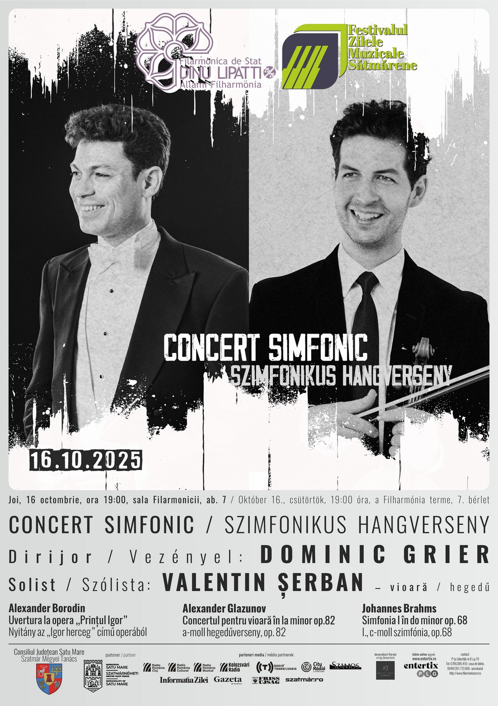 Csütörtökön, október 16-án 19 órától szimfonikus koncert következik Dominic Grier karmester vezényletével, a zenekar vendége pedig Valentin Șerban hegedűművész, a „George Enescu” verseny győztese lesz. A program három kiemelkedő művet vonultat fel: Alexander Borodin Nyitány az Igor herceg című operából, egy oldalról erővel, másfelől nemesi tartással teli darab; Alexander Glazunov Hegedűverseny a-moll, op. 82, mely költői párbeszéd a szólista és a zenekar között, gazdag lírában és virtuozitásban; valamint Johannes Brahms I. c-moll szimfónia, op. 68, a romantikus szimfonikus irodalom monumentális remekműve, a belső erő és a mélység megtestesítője.