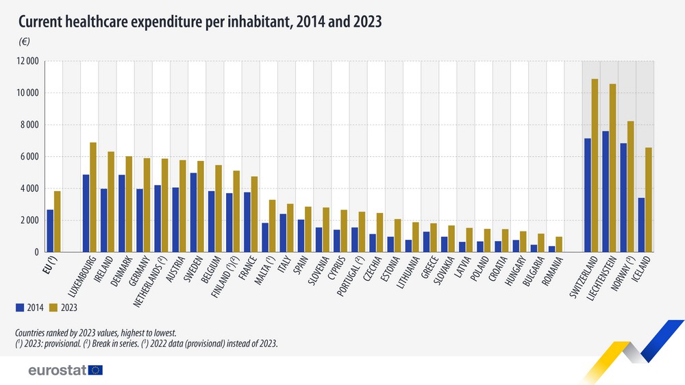 Az egy főre jutó egészségügyi kiadások uniós szinten 2014 és 2023 között 2 668 euróról 3 835 euróra nőttek, ami 43,7 százalékos emelkedés. Románia ebben papíron látványos eredményt produkált, hiszen tíz év alatt 155,6 százalékkal nőtt a fejenkénti költés, és így elérte a 971 eurót, ez azonban elsősorban azt jelzi, hogy rendkívül alacsony bázisról indult, és jelenleg is az unió egyik legkevesebb pénzből gazdálkodó egészségügyi rendszere.