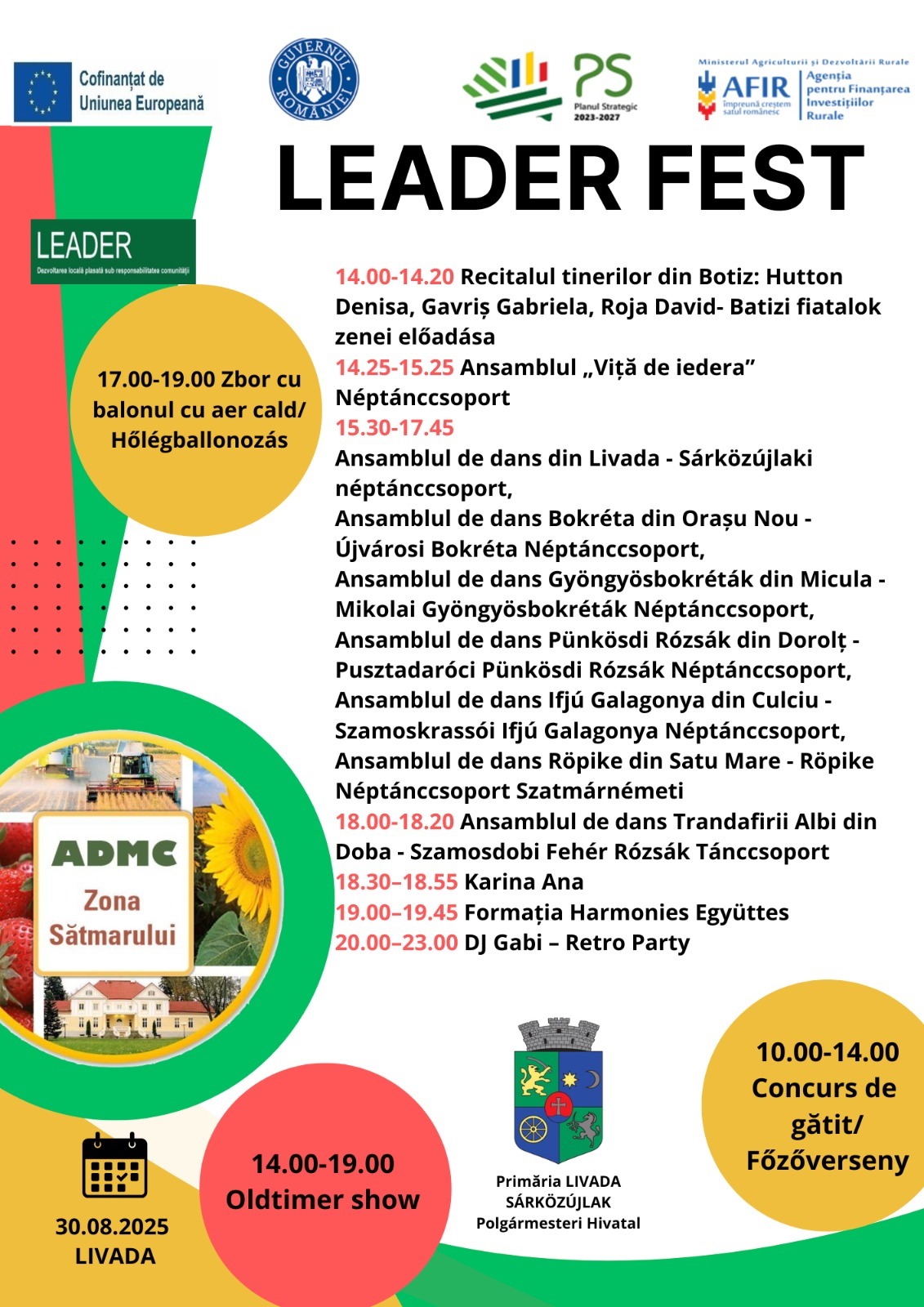 A fesztivál szombati napja különleges tartalommal egészül ki: a Leader Fest keretében a látogatók betekintést nyerhetnek a Szatmár Környéki Helyi Akciócsoport (GAL Zona Sătmarului) által támogatott sikeres projektekbe. A rendezvény célja, hogy a helyi közösségek és a vállalkozói szféra képviselői megismerhessék azokat a jó gyakorlatokat, amelyek a térség fejlődését szolgálják, valamint naprakész információkat kapjanak az új finanszírozási lehetőségekről.