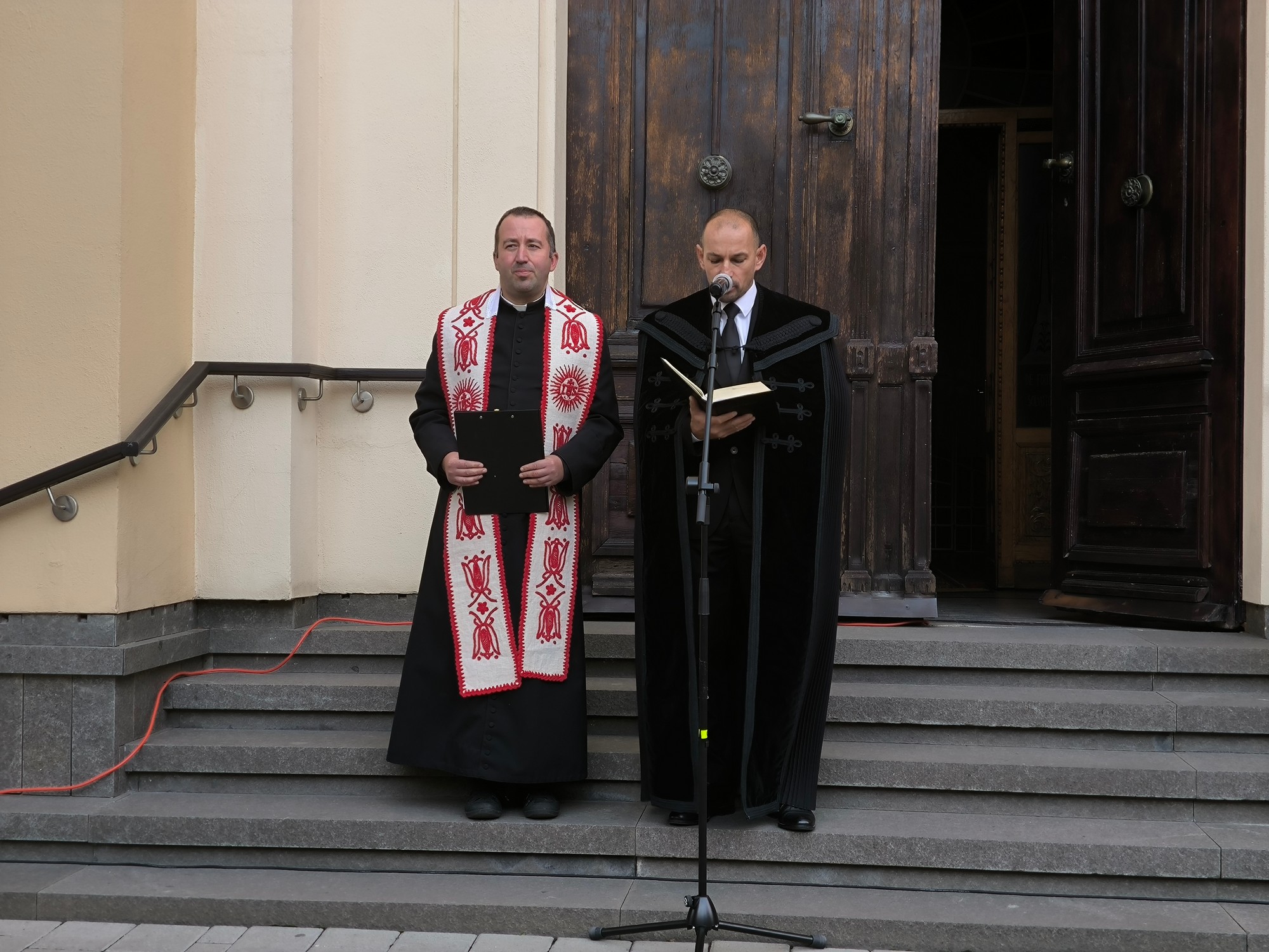 A tábori lelkész emléktáblájánál zajló megemlékezést a Szózat közös eléneklése nyitotta meg, majd Tatár Zoltán római katolikus lelkész és Varga Szilárd Csaba református lelkipásztor mondott imát.