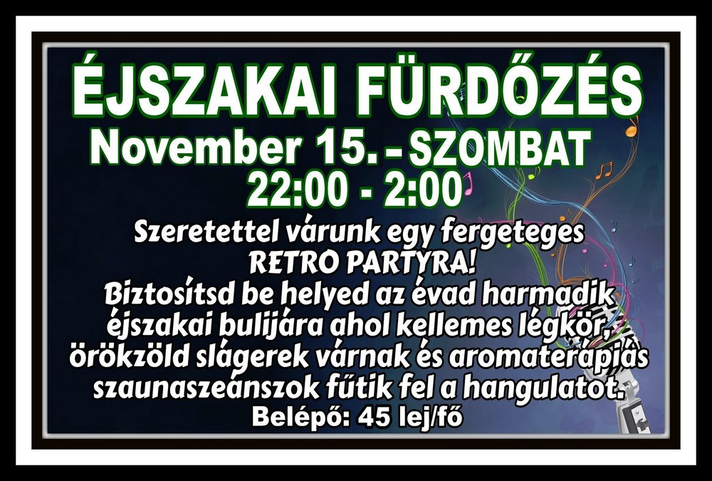Csatlakozz hozzánk, és engedd, hogy a retro dallamok, a termálvíz és az aromaterápia egy varázslatos őszi éjszakán felejthetetlen élménnyé olvadjanak össze!" - üzeni a közkedvelt élményfürdő.