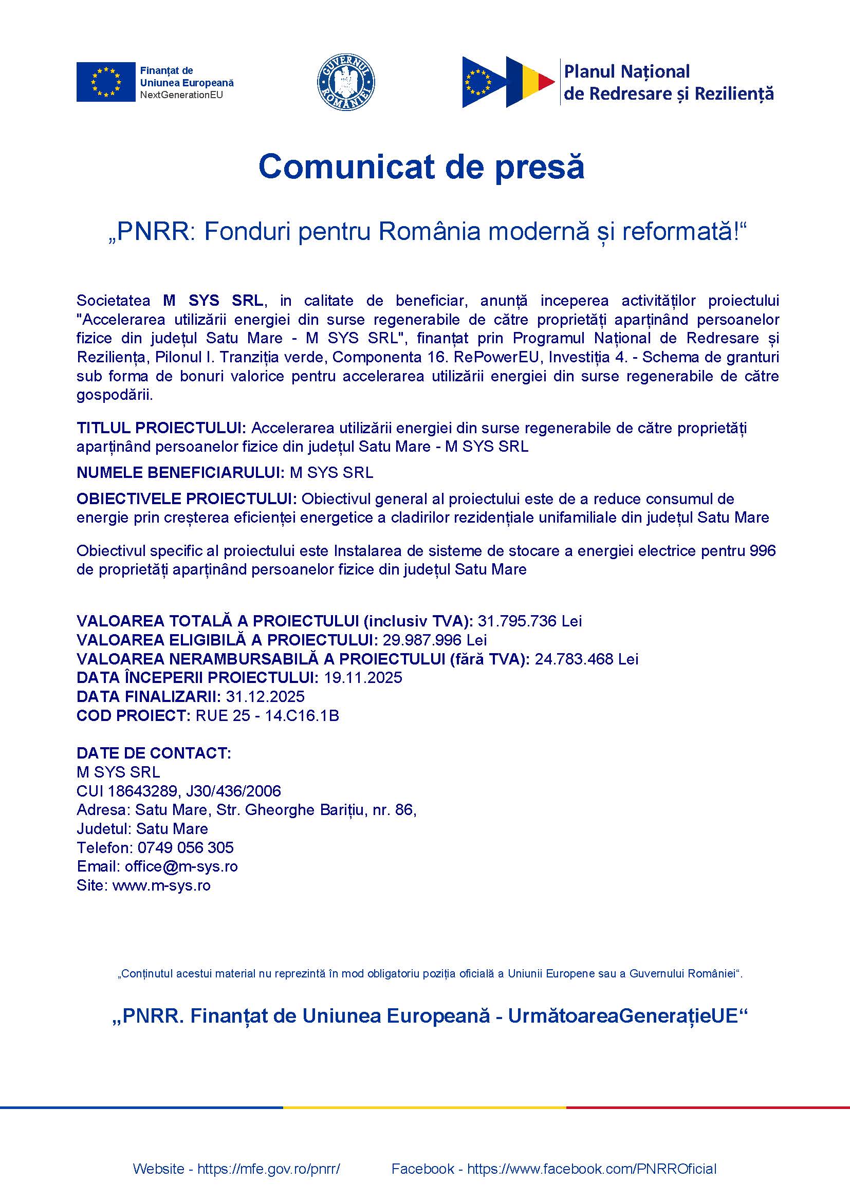 Az M SYS SRL bejelenti, hogy több mint 5 millió euró támogatást kapott a Nemzeti Helyreállítási és Reziliencia Terv – RePowerEU keretében, amelynek célja villamosenergia-tároló rendszerek telepítése Szatmár megye háztartásaiba. Az M SYS az egyetlen olyan vállalat Szatmár megyében, amelyet kiválasztottak az Investment 4 – Component 16 RePowerEU keretében ilyen típusú projekt megvalósítására.